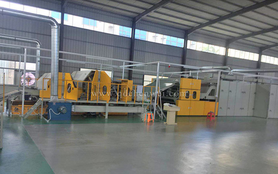 開包機(jī)-開松機(jī)-振動(dòng)給棉機(jī)-梳理機(jī)-立式鋪網(wǎng)機(jī)-烘房-成卷切片機(jī)